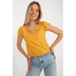 Halenka s krátkými rukávy ve tvaru bufetu a kulatým výstřihem. Na přední straně zdobená šperky.