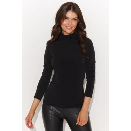 Funkční dámská halenka z elastické neprůhledné tkaniny je klasikou mezi halenkami. Výstřih v podobě praktického roláku v kombinaci s dlouhými rukávy vás zahalí v chladnějších dnech. Pozlacená destička v horní části zad mezitím dodává jemnou eleganci. Díky svému jednoduchému tvaru je ideální pro ležérní stylizaci, kterou můžete nosit jak do kanceláře, tak do města. Dámský rolák se skvěle hodí jak ke kalhotám na míru, tak ke kalhotám střihu mom fit. Tato halenka kombinuje funkčnost s elegancí a vytváří tak úspěšný recept na vzhled.