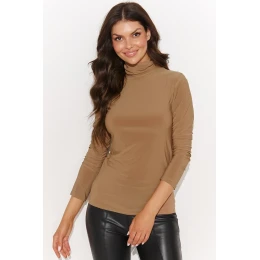 Funkční dámská halenka z elastické neprůhledné tkaniny je klasikou mezi halenkami. Výstřih v podobě praktického roláku v kombinaci s dlouhými rukávy vás zahalí v chladnějších dnech. Pozlacená destička v horní části zad mezitím dodává jemnou eleganci. Díky svému jednoduchému tvaru je ideální pro ležérní stylizaci, kterou můžete nosit jak do kanceláře, tak do města. Dámský rolák se skvěle hodí jak ke kalhotám na míru, tak ke kalhotám střihu mom fit. Tato halenka kombinuje funkčnost s elegancí a vytváří tak úspěšný recept na vzhled.