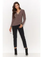Funkční dámská halenka z elastické neprůhledné tkaniny je klasikou mezi halenkami. Výstřih v podobě praktického roláku v kombinaci s dlouhými rukávy vás zahalí v chladnějších dnech. Pozlacená destička v horní části zad mezitím dodává jemnou eleganci. Díky svému jednoduchému tvaru je ideální pro ležérní stylizaci, kterou můžete nosit jak do kanceláře, tak do města. Dámský rolák se skvěle hodí jak ke kalhotám na míru, tak ke kalhotám střihu mom fit. Tato halenka kombinuje funkčnost s elegancí a vytváří tak úspěšný recept na vzhled.