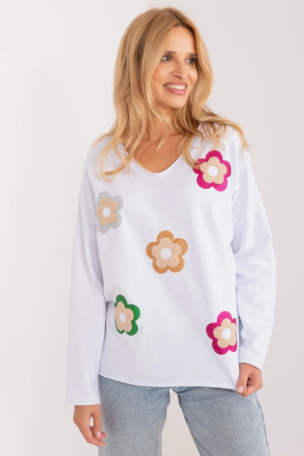 Představujeme jedinečnou halenku pro volný čas, která dokonale kombinuje pohodlí a styl. Tento oděv je ideální pro každodenní nošení a zároveň poskytuje decentní ležérní vzhled. Halenka zaujme svým převládajícím vzorem, přičemž přední stranu zdobí půvabné květy, které celému vzhledu dodávají lehký a svěží nádech. Tyto aplikace dělají z halenky nejen oděv, ale také vyjádření individuálního stylu. Halenka je vyrobena z vysoce kvalitní bavlny, která zaručuje maximální pohodlí při nošení. Díky použitému materiálu je oděv měkký, prodyšný a ideální pro různá roční období, což poskytuje příjemný pocit i při dlouhodobém nošení. Díky standardní délce halenky a dlouhým rukávům je skvělou volbou pro nejrůznější příležitosti ? ať už na setkání s přáteli, běžné nákupy nebo relaxační procházku. Výstřih do V dodává halence lehkost a jemnou eleganci, což z ní činí dokonalý kousek šatníku pro každou ženu, která si cení pohodlí a stylu. Ležérní halenka s květinovým motivem je určena pro ty, které chtějí spojit ležérnost s módní rafinovaností.