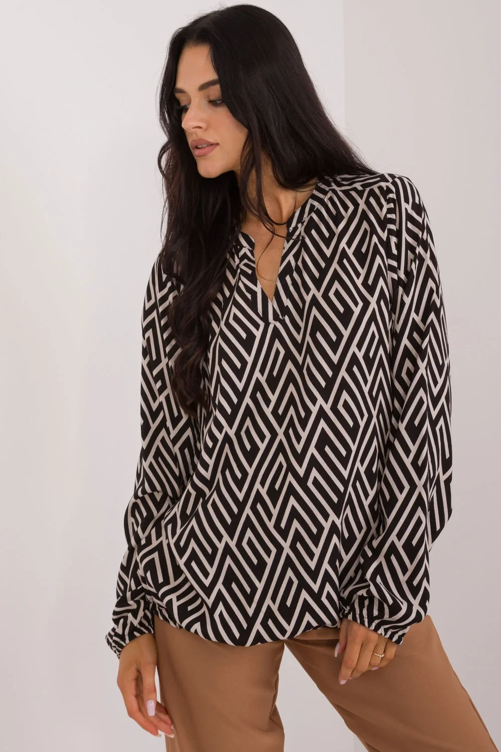 Casualová dámská halenka, ideální na každý den i do práce. Vyrobená z ekologické viskózy, kombinuje módní styl s péčí o životní prostředí. Geometrický vzor jí dodává moderní charakter a nafouklý dlouhý rukáv dodává jemné eleganci. Výstřih v srdcovém tvaru s límečkem zdůrazňuje krk a dodává halence eleganci. Standardní délka ji činí univerzálním kouskem garderoby, ideálním pro různé stylizace. Je to nabídka pro ženy, kteří ocení styl, pohodlí a ekologickou módu.