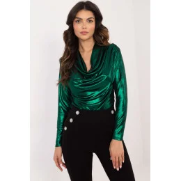 Elegantní blůzka s rafinovaným charakterem, ideální na významné události a večírky. Vyrobena z lesklého materiálu z polyesteru a viskózy, který přitahuje pozornost a dodává outfitům lesk. Blůzka má rozmanitou texturu materiálu, co jí dodává jedinečný vzhled. Má dlouhý rukáv a volný výstřih, který se krásně přizpůsobuje postavě, dodávajíc celku lehkost a eleganci. Dekorativní záhyby na materiálu zavádějí další prvek šiku, zdůrazňující její originální design. Standardní délka dělá z blůzky skvělou kombinaci s různými outfitmi.