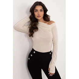 Elegantní, přiléhavá halenka ideální na speciální příležitosti, jako jsou večírky a schůzky. Vyrobená z směsi polyesteru a viskózy s různorodou strukturou, která jí dodává zvláštní charakter. Asymetrický výstřih přidává modernost a ozdobné záhyby jemně zdůrazňují eleganci střihu. Halenka má dlouhé rukávy zakončené manžetami s dírkou na palec, co vytváří efektní a pohodlné zakončení. Standardní délka umožňuje skvěle kombinovat jak s elegantními kalhotami, tak s sukněmi, vytvářející stylový a rafinovaný vzhled.