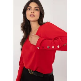 Elegantní blůzka klasického střihu, ideální na společenské příležitosti. Vyrobená z polyesteru, viskózy a elastanu, poskytuje pohodlí a lehce se přizpůsobuje postavě. Hladká látka zdůrazňuje minimalistický charakter blůzky a výstřih do V přidává jemnou eleganci. Dlouhé nadýchané rukávy s širokými manžetami na knoflíčky tvoří výrazný akcent, dodávající celku originální a stylový vzhled. Standardní délka činí tuto blůzku univerzálním prvkem elegantních outfitů.