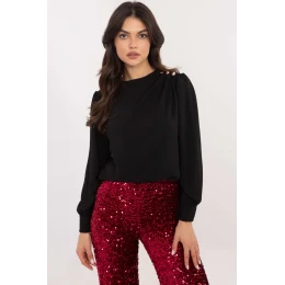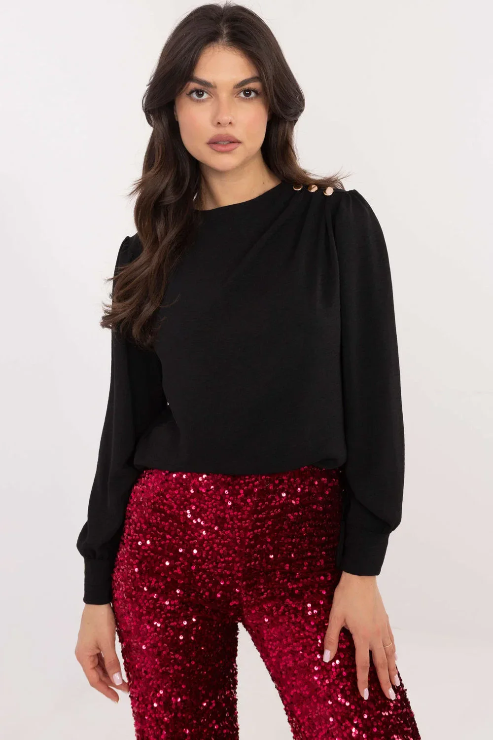 Elegantní blůzka s jemným ženským stylem, ideální na slavnostní příležitosti i do práce. Vyrobena z hladké látky směsi polyesteru a elastanu, která poskytuje pohodlí a jemně se přizpůsobuje postavě. Blůzka má kulatý výstřih a její ozdobou jsou efektní dlouhé rukávy, které dodávají eleganci. Vypasované rukávy s ozdobnými záhyby na ramenou a jemnými knoflíčky dodávají celku výjimečný charakter. Standardní délka umožňuje blůzku skvěle kombinovat jak s sukněmi, tak s kalhotami, vytvářející elegantní outfit.