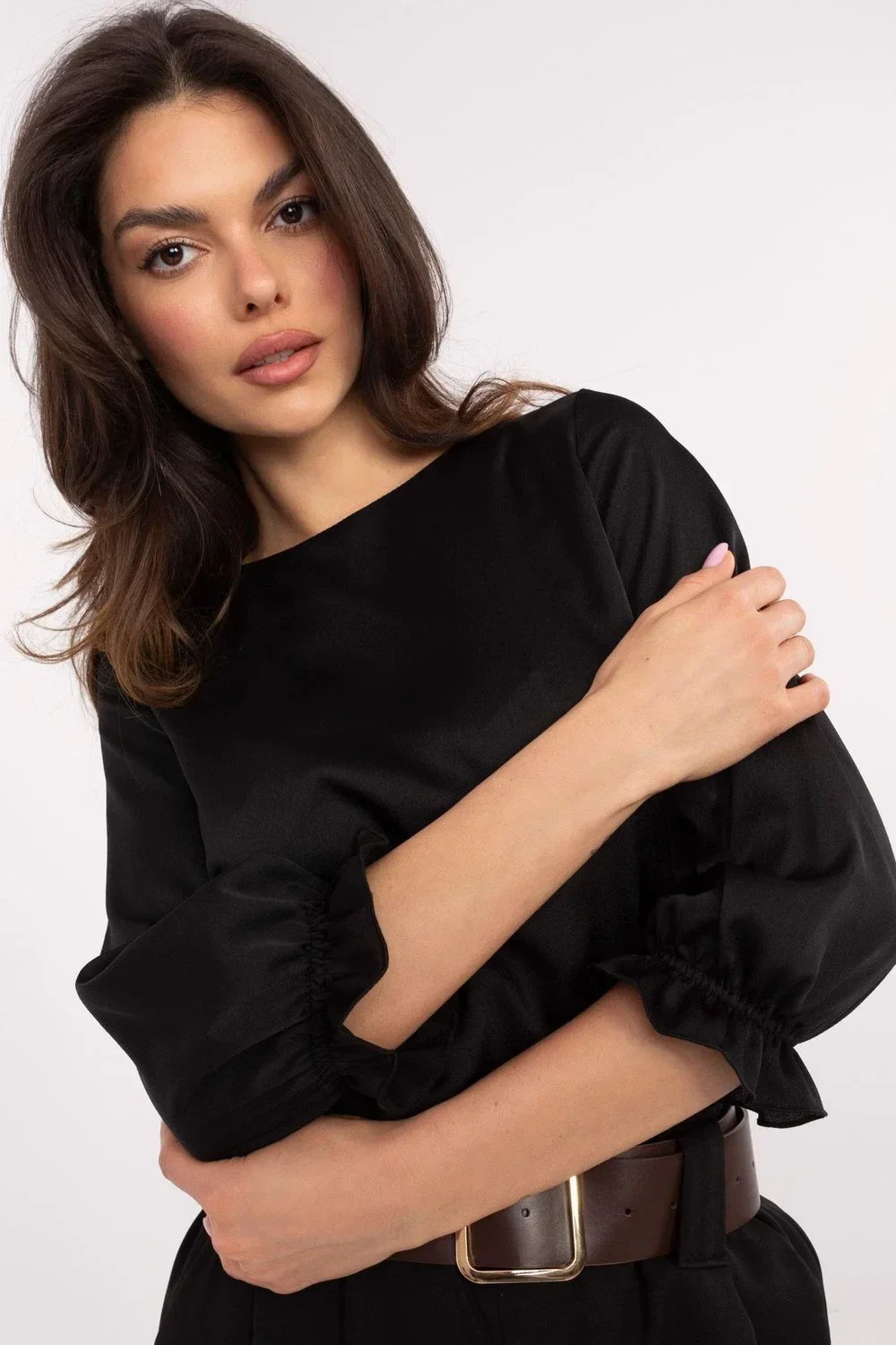 Elegantní blůzka klasického střihu, ideální na každý den, do práce nebo na formální události. Vyrobená z směsi viskózy a polyesteru, poskytuje pohodlí, prodyšnost a odolnost. Hladký vzor jí dodává minimalistický a zároveň stylový charakter. Model má standardní délku a 3/4 rukávy, které byly ozdobeny jemnými volánky, dodávajícími celkovému vzhledu jemný ženský akcent. Kulatý výstřih zdůrazňuje elegantní jednoduchost střihu. Blůzka skvěle ladí jak s elegantními kalhotami, tak s sukněmi, vytvářející stylové a univerzální outfit.