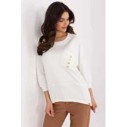 Elegantní a pohodlný každodenní top vyrobený z vysoce kvalitní bavlny s přídavkem elastanu. Model z hladké látky s kulatým výstřihem a 3/4 rukávem poskytuje pohodlí pro každodenní nošení. Délka topu jej skvěle ladí jak s džíny, tak s elegantními kalhotami. Na přední straně je praktická kapsa zdobená dekorativními knoflíky, dodávající jemný šarm.