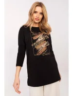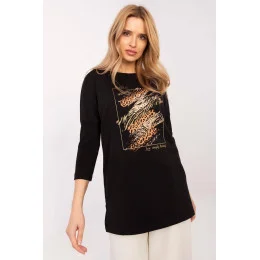 Stylový top s prodlouženým střihem, ideální na každý den. Vyrobený z vysoce kvalitní bavlny s přídavkem elastanu, zajišťuje pohodlné nošení a volnost pohybu. Model s delší délkou, s 3/4 rukávem a kulatým výstřihem, se skvěle hodí do různých stylizací. Dominantní vzor s motivem zvířat vpředu jí dodává módní a výrazný charakter. Skvěle se hodí k legínám, džínám nebo přiléhavým kalhotám, ideální pro ženy, které oceňují pohodlí a styl.