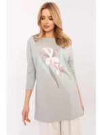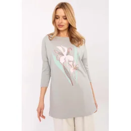 Elegantní blůza s prodlouženým střihem, skvělá na každý den. Vyrobena z vysoce kvalitní bavlny s přídavkem elastanu, zaručuje pohodlí nošení a ideální přizpůsobení. Model s delší délkou, s 3/4 rukávem a klasickým kulatým výstřihem, kombinuje pohodlí a styl. Přední část zdobí decentní potisk květinami, dodávající blůze ženský a romantický charakter. Skvěle ladí jak s legíny, džíny, tak i se slim fit kalhotami, vytvářející moderní a volnou stylizaci.
