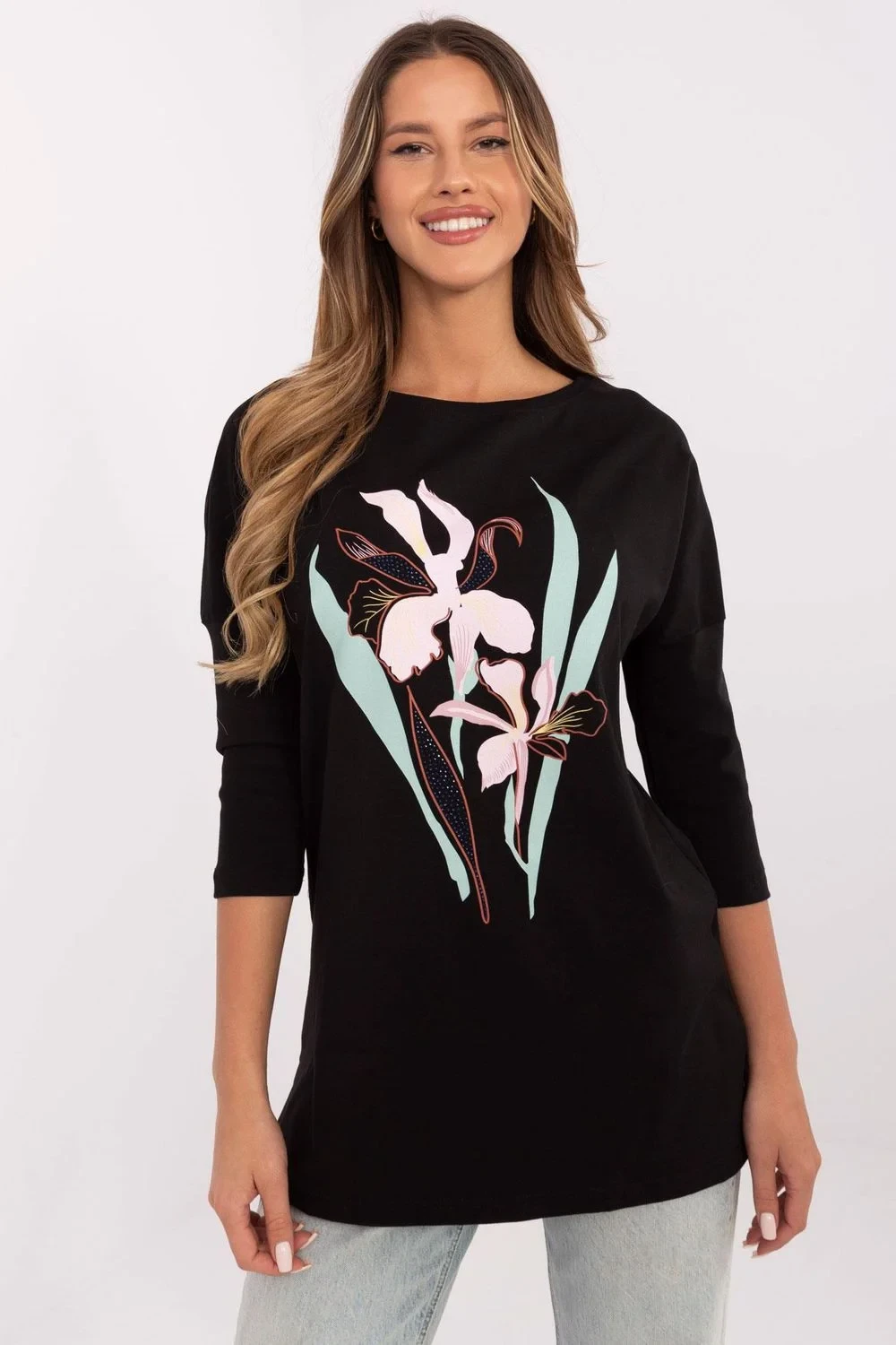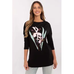 Casual dámský top, který kombinuje pohodlí s módním akcentem. Vyrobený z měkké a elastické směsi bavlny a elastanu, poskytuje pohodlí při nošení a skvěle padne k postavě. Standardní délka s kulatým výstřihem a 3/4 rukávy, které jsou vyrobeny z hrubšího materiálu. Potisk na přední straně dodává topu charakter a originální vzhled. Ideální na každý den, skvěle se hodí jak do volných, tak do ženských stylizací.