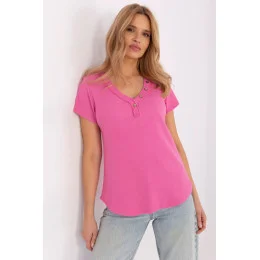 Přizpůsobený každodenní top v casual stylu, ideální na každý den i do práce. Vyrobený z vysoce kvalitní bavlny s přídavkem elastanu, co zajišťuje pohodlí nošení a lehkou pružnost. Hladký materiál s podélnou strukturou přidává jemnou texturu a ozdobné knoflíky jsou stylovým doplňkem. Top má standardní délku, krátké rukávy a ženský výstřih do V, který zdůrazňuje krk a dekolt. Skvěle se přizpůsobuje postavě, tvoří univerzální kus oblečení pro mnoho příležitostí.