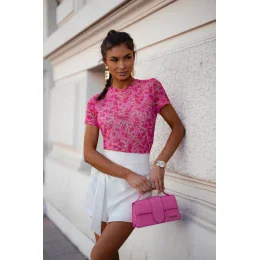Košile z tylu s krátkým rukávem je výjimečným kouskem šatníku, který spojuje lehkost a eleganci. Vyrobena z jemného, poloprůhledného materiálu, jemně zdůrazňuje postavu a dodává stylizaci ženského šarmu. Kulatý výstřih přidává klasický charakter, a barevný potisk přitahuje pozornost a dodává košili nezaměnitelný výraz. Ideální jak do každodenního nošení, tak na speciální příležitosti, skvěle ladí s džíny, sukní nebo elegantními kalhotami.