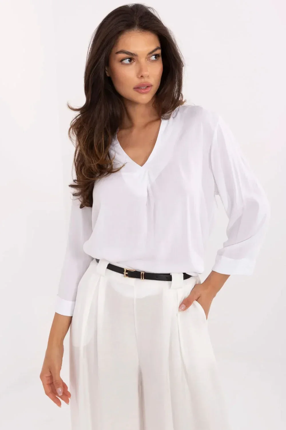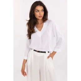 Každodenní volnější košile je ideální nabídkou jak pro běžné nošení, tak i do práce. Ušitá z příjemného, ekologického viskózu, kombinuje pohodlí nošení s ohledem na životní prostředí. Model s hladkým zpracováním, s výstřihem do V a s 3/4 rukávem, vypadá elegantně a žensky. Jemným ozdobným prvkem je jemný záhyb vpředu, který dodává celku jemný půvab a lehkost. Standardní délka a absence zapínání zajišťuje, že košile je pohodlná a snadno se obléká. Jedná se o univerzální a stylovou nabídku, která se hodí do mnoha každodenních stylizací.