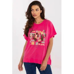 Casual dámský top ideální pro každodenní outfit. Vyrobena z vysoké kvality směsi bavlny a elastanu, zaručuje pohodlí a volnost pohybu. Model s standardní délkou, s krátkým rukávem a klasickým, kulatým výstřihem, skvěle se hodí do mnoha každodenních kombinací. Top zdobí efektní potisk obohacený aplikací a drobnými džety, které dodávají celku jemný lesk a moderní charakter. Ideální volba pro ženy, které rády kombinují pohodlí se subtilními, trendy detaily.