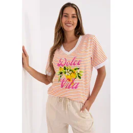 Pohodlný a stylový top s casual charakterem, ideální na každý den i do práce. Vyrobený z prodyšné směsi bavlny s přídavkem elastanu, zaručuje pohodlí a jemné přizpůsobení postavě. Standardní délka a krátký rukáv dělají z tohoto kousku skvělou volbu na teplé dny, a výstřih ve tvaru V jemně zdůrazňuje krk a přidává ženský půvab. Pruhovaný vzor s potiskem dodává celku moderní akcent, ideální pro ženy, které rády spojují pohodlí s výrazným stylem. Skvěle ladí jak s džíny, tak s sukni, nezbytný kousek v každodenní šatníku!