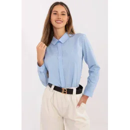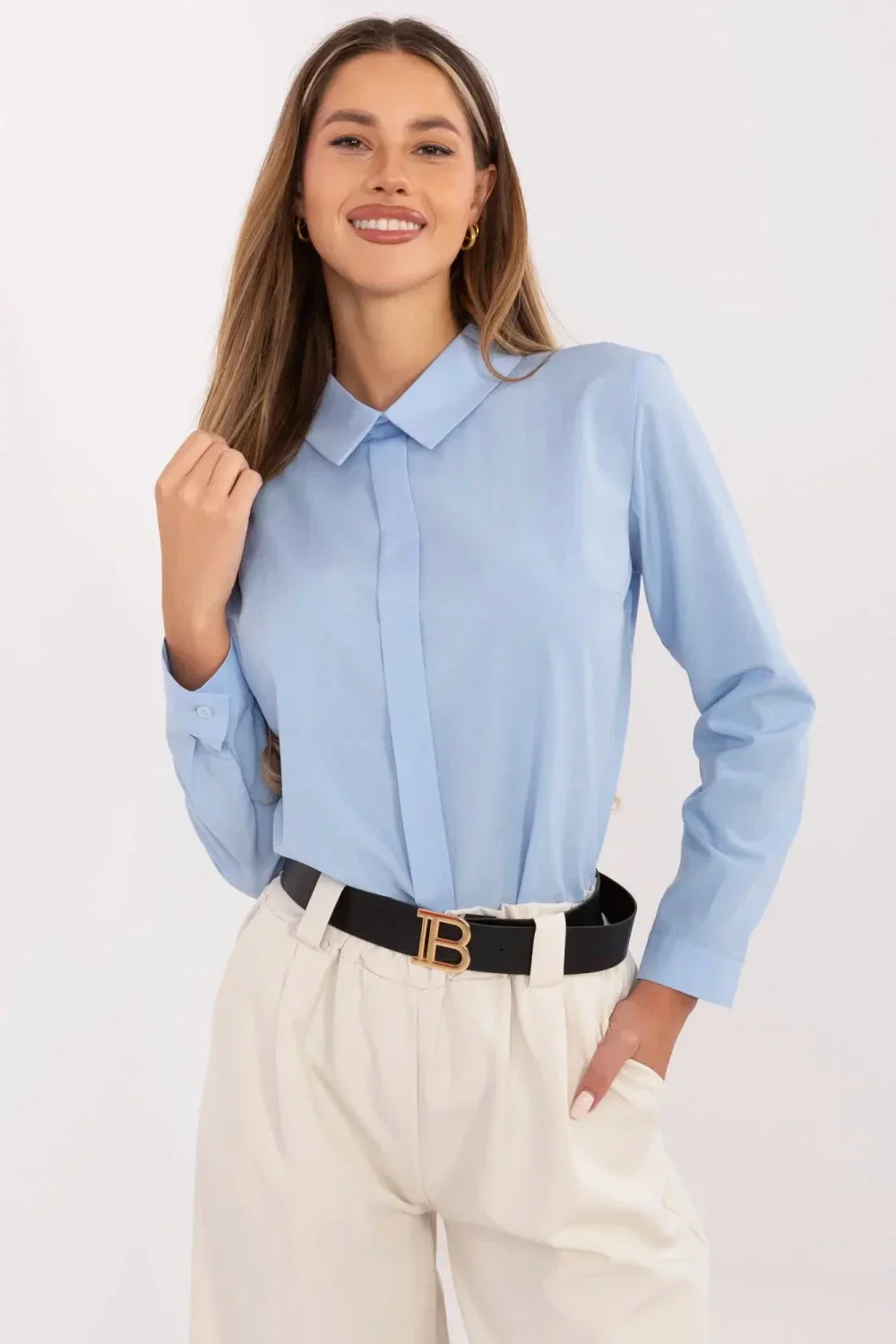 Elegantní košilová blůza s klasickým střihem je ideální volbou na různé příležitosti, hodí se jak jako součást elegantního outfitu, tak i jako každodenní oblečení do práce. Vyrobená z převládající bavlny poskytuje pohodlí a prodyšnost po celý den. Hladký materiál zdůrazňuje minimalistický, nadčasový charakter blůzy, a ozdobný proužek na přední straně jí dodává jemného půvabu a elegance. Model s standartní délkou, s dlouhým rukávem a klasickým límečkem se skvěle hodí k saku, kalhotám s opletenými lemy nebo tužkové sukni. Jedná se o univerzální kousek šatníku, který by neměl chybět v žádném dámském šatníku.