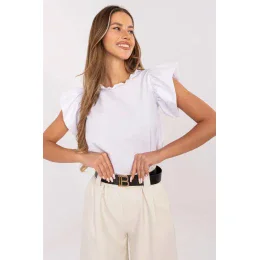 Elegantní blůza s hladkým zpracováním je nadčasovým návrhem pro ženy, které ocení klasiku a jemné detaily. Vyrobená z převažující bavlny poskytuje pohodlí nošení a zároveň vypadá velmi stylově a žensky. Blůza má standardní délku, díky čemuž se skvěle hodí jak k kalhotám, tak k sukním. Krátké rukávy ve formě volánků jí dodávají lehkosti a romantického charakteru, zatímco kulatý výstřih zakončený drobným ozdobným volánem představuje elegantní akcent, který přitahuje pozornost. Je to ideální volba na slavnostní příležitosti a do práce, skvěle se hodí do kancelářských stylizací, spojující pohodlí s elegancí.