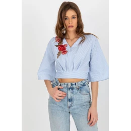 Elegantní dámská košile vyrobená z převažující přírodní bavlny, která poskytuje pohodlí a prodyšnost. Model s krátkou délkou skvěle ladí s džínami, sukněmi nebo kalhotami s vysokým pasem. Košile má rukávy délky 3/4 a ženský výstřih do dekoltu, který jemně zdůrazňuje linii krku. Jemné proužky dodávají celku lehkost a svěžest, zatímco jedinečný detail, šněrování na zádech, přidává košili neokázalý charakter. Na přední straně je umístěn nášivka ve formě květů a listů, která zavádí jemný rostlinný akcent a zdůrazňuje jemný, ženský styl. Jedná se o ideální volbu na teplé dny, jak pro každodenní nošení, tak pro speciální příležitosti.