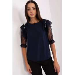 Elegantní blůza standardní délky vyrobená z kombinace bavlny, elastanu a polyesteru, spojující pohodlí nošení s elegantním vzhledem. Hladká látka poskytuje ideální pozadí pro jemné, ozdobné korálky umístěné na ramenou, které dodávají celku výjimečný charakter. Model se 3/4 rukávem z jemné síťoviny dodává lehkost a ženské kouzlo, zatímco klasický kulatý výstřih zdůrazňuje elegantní jednoduchost střihu. Skvělá na společenské události i do práce, v kombinaci jak s elegantními kalhotami, tak s sukní.
