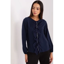 Elegantní top standardní délky vyrobený z kombinace polyesteru, viskózy a elastanu, poskytující pohodlí a bezchybný vzhled po celý den. Hladká látka zdůrazňuje rafinovaný charakter modelu a svislý volán na přední straně, zdobený drobnými korálky, přidává jemný lesk a originalitu. Klasický, kulatý výstřih a dlouhý rukáv dávají topu univerzální, elegantní charakter. Bez zapínání je model pohodlný na oblékání. Ideální jak do práce, tak na elegantní setkání.