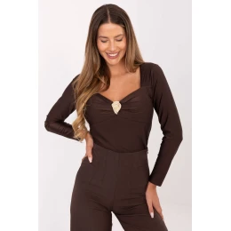 Elegantní blůza standardní délky vyrobená z převažující směsi viskózy a polyesteru, která spojuje pohodlí nošení s decentní elegancí. Model se vyznačuje hladkým dokončením a ženským dekoltem ve tvaru srdce, kolem kterého se nachází ozdobný kovový prvek a jemné rouchání, které dodává celku výjimečný charakter. Vsazené, zpevněné košíčky zajistí ideální přizpůsobení a podporu prsou, díky čemuž se blůza prezentuje mimořádně elegantně bez dalšího prádla. Dlouhé rukávy zdůrazňují formální styl a absenci zapínání činí model pohodlným a praktickým. Skvělý návrh na slavnostní příležitosti, obchodní schůzky nebo elegantní výstupy.