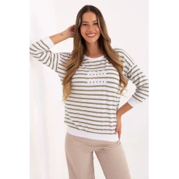 Casual dámský top vyrobený z měkkého mikromodálu s přídavkem elastanu, který zajišťuje pohodlí a ideální přizpůsobení postavě. Klasický, kulatý výstřih a dlouhé rukávy dělají z modelu pohodlný a univerzální kousek, skvělý jak do práce, tak na každý den. Top má standardní délku a je zdoben jemným pruhovým vzorem, nášivky na přední straně dodávají topu moderní a trendy charakter. Model bez zapínání, snadno kombinovatelný s ostatními kousky oblečení.