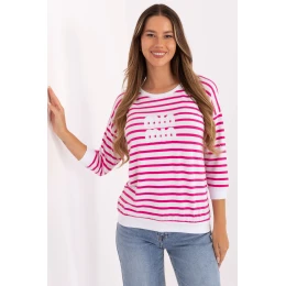Dámský volný top vyrobený z měkkého mikromodálu s přídavkem elastanu, který zajišťuje pohodlí a ideální přizpůsobení postavě. Klasický kulatý výstřih a dlouhé rukávy dělají z modelu pohodlný a univerzální kousek, skvělý jak do každodenního nošení, tak do práce. Top má standardní délku a je zdoben jemným pruhovaným vzorem, nášivky na přední straně dodávají topu módní a moderní charakter. Model bez zapínání, snadno kombinovatelný s ostatními kousky šatníku.