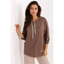 Blůza každodenního stylu casual, ideální na každý den. Vyrobena z měkké bavlny s přídavkem elastanu, poskytuje pohodlí a volnost pohybu. Má standardní délku, 3/4 rukáv a kulatý výstřih s ozdobnými šňůrkami, které jí dodávají lehký, ženský charakter. Přední část zdobí decentní vyšívaný motiv a dole na levé straně je stylová nášivka zdůrazňující moderní design. Jedná se o univerzální model, který se skvěle hodí jak do práce, tak do každodenních outfitů.