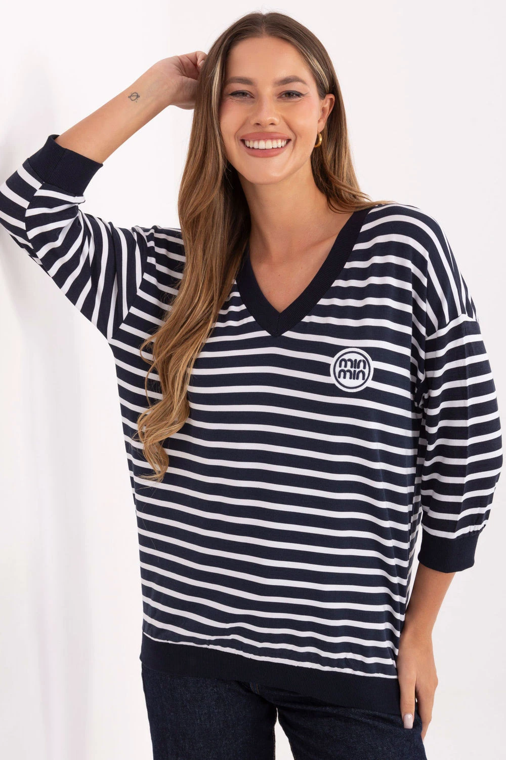 Klasický dámský tričko s proužky a nášivkou na přední straně je pohodlný a stylový návrh pro každodenní příležitosti. Vyrobený z měkkého micro modalu s přídavkem elastanu poskytuje pohodlí a volnost pohybu po celý den. Model standardní délky s 3/4 rukávem a výstřihem do V kombinuje klasický střih s moderním detail ve formě nášivky, díky čemuž se skvěle hodí do každodenních stylizací, jak s kalhotami, tak s sukní.