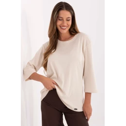 Casual dámský top s hladkým vzorem je univerzální volbou pro každodenní stylizace. Vyrobený z příjemného materiálu, poskytuje pohodlí po celý den. Model s standardní délkou, s 3/4 rukávem a klasickým kulatým výstřihem spojuje jednoduchost s pohodlím, a proto se skvěle hodí do každodenních outfitů jak s kalhotami, tak s sukni.