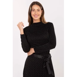 Tato elegantní dámská blůzka je nabídkou pro ženy, které oceňují styl a jemný lesk při každé příležitosti nebo při večerním vycházení. Model je přizpůsobený, má standardní délku, dlouhý rukáv a klasický půlkolík, co mu dodává eleganci. Vyrobená z měkké směsi viskózy a polyesteru, je blůzka příjemná na dotek, elastická a pohodlná na nošení. Celý povrch zdobí ozdobné flitry, které dodávají jemný lesk a výjimečný šarm každému outfitu. Bez zapínání je blůzka praktická a snadno se obléká, a její klasický střih umožňuje kombinaci s různými sukněmi, kalhoty nebo elegantními kalhotami na večírek.