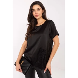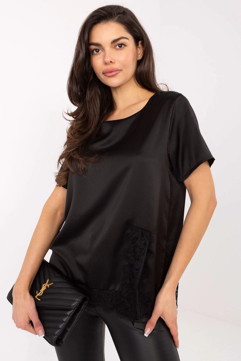 Elegantní a ženská blůza s elegantním charakterem, skvělá jak do každodenního nošení, tak do práce nebo na setkání. Vyrobená z vysoce kvalitní směsi polyesteru a elastanu, je příjemná na dotek, elastická a pohodlná na nošení. Model s standardní délkou a krátkým rukávem a kulatým výstřihem, který jemně zdůrazňuje krk. Hladký materiál jí dodává univerzálnost a krajkové zakončení na spodku přidává celkové jemnosti a elegantního akcentu. Ideální volba pro ženy, které ocení klasický styl s nádechem ženské elegance.