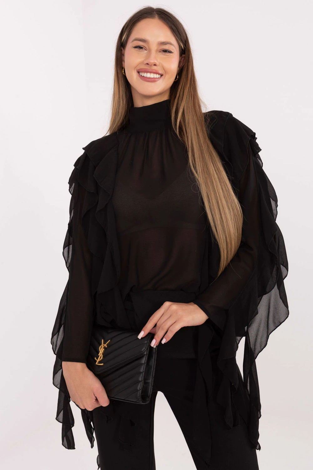 Elegantní dámská halenka je ideální volbou pro každodenní nošení, společenské události a večírky, kdy chcete zdůraznit svůj styl subtilním, ale efektním způsobem. Její hladký vzor dodává celku eleganci a umožňuje snadné zkombinování jak s elegantními kalhotami, tak s sukní. Model je vyroben z příjemné směsi viskózy a polyesteru, díky čemuž je halenka měkká, lehce elastická a krásně padne na postavě. Standardní délka a dlouhý rukáv dodávají halence elegantní a univerzální vzhled. Golínek zdůrazňuje krk a přidává trochu elegantní tajemnosti, a knoflíčkové zapínání na krku usnadňuje oblékání a představuje jemný dekorační prvek. Halenka také okouzluje výjimečnými detaily, ozdobnými volány na zádech, přední části a rukávech, které jí dodávají lehkost, romantický charakter a módní eleganci. Je to skvělá volba pro ženy, které rády kombinují subtilní klasiku s efektními, ženskými detaily.