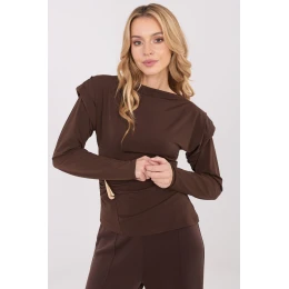 Elegantní blůza standardní délky, vyrobena z dominující směsi polyesteru a viskózy, která zajišťuje pohodlí nošení, měkký pocit materiálu a ideální padání na postavě. Držena v hladkém, minimalistickém vzoru, skvěle se hodí na mnoho příležitostí, od každodenních stylizací, přes pracovní sestavy, až po návštěvy a večerní výlety. Model má dlouhý rukáv a dekolt typu lodník, který jemně zdůrazňuje linii krku a dodává blůze klasický, elegantní charakter. Vložené polštářky na ramenou dodávají postavě krásné proporce a přidávají moderní vzhled. Blůza je dokončena záhyby na ramenou a na pravé straně, které opticky tvarují linii těla. Na místě záhybu na pravé straně je umístěn kovový doplněk, který je stylovým a přitažlivým detail. Model nemá zapínání, díky čemuž je pohodlný při oblékání a skvěle padne při nošení. Ideální volba pro ženy, které oceňují kombinaci elegance, moderního provedení a pohodlí.