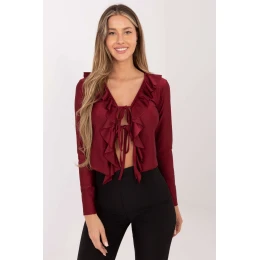 Elegantní dámská halenka je ideální volbou na společenské události, slavnostní výstupy a večírky, kde záleží na stylu a sofistikovanosti. Udržovaný v elegantním stylu, ohromuje jemnou formou a ženskými detaily. Model vyrobený z kombinace polyesteru a viskózy poskytuje lehkost, pohodlí a krásné uspořádání materiálu na siluetě. Hladký, dominující vzor dodává halence minimalistický charakter, díky čemuž se skvěle hodí jak klasické sukně, tak elegantní kalhoty. Halenka má krátkou délku, co dodává outfitu moderní výraz, a dlouhý rukáv skvěle zapadá do společenského charakteru modelu. Největší ozdobou je výstřih s efektním vázáním, které nahrazuje tradiční knoflíkové zapínání a zároveň vytváří jemný romantický akcent. Další volán na přední straně dodává celku lehkost a jemnou eleganci, zdůrazňující ženský styl halenky. Jedná se o výjimečnou volbu pro ženy, které ocení eleganci v kombinaci s moderními, dekorativními detaily. Ideální na oslavy, rodinné události nebo stylové večerní výstupy.