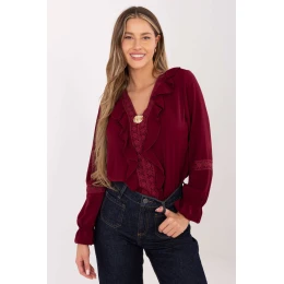 Elegantní dámská halenka je stylovým návrhem, který se skvěle hodí jak na formální události, tak do práce nebo na každodenní nošení. Její klasický tvar byl obohacen o dekorativní detaily, díky nimž působí mimořádně žensky a elegantně. Model vyrobený ze směsi viskózy, polyesteru a elastanu zaručuje pohodlí nošení, elasticitu a krásné přizpůsobení se postavě. Hladký dominantní vzor činí halenku univerzální a skvěle ladí jak s elegantní dolní částí, tak s každodenními kousky oblečení. Halenka má standardní délku a dlouhý rukáv zakončený decentní volánkou, která celku dodává jemný, ženský charakter. Výstřih do V opticky zjemňuje krk a absence tradičního zapínání zaručuje výjimečnou pohodlí. K halence dodávají zvláštní kouzlo krajkové vložky vpředu a na rukávech, tvořící elegantní a romantický akcent. Navíc model vyniká dekorativními volány a efektní broží, které zdůrazňují formální, stylový charakter halenky. Ideální volba pro ženy oceníce eleganci, jemné detaily a pohodlí na každý den.