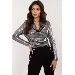 Elegantní blůzka s rafinovaným charakterem, ideální na návštěvy a večírky. Vyrobená z lesklého materiálu ze směsi polyesteru a viskózy, který přitahuje pozornost a dodává stylizaci lesku. Blůzka má bohatou texturu materiálu, co jí dodává jedinečný vzhled. Má dlouhý rukáv a splývavý výstřih, který se krásně usazuje na postavě, dodávajíc celku lehkost a eleganci. Dekorativní zástřihy na materiálu vnášejí do outfitu další prvek elegancie, zdůrazňujíce její originální design. Standardní délka zaručuje, že se blůzka skvěle hodí k různým stylizacím.