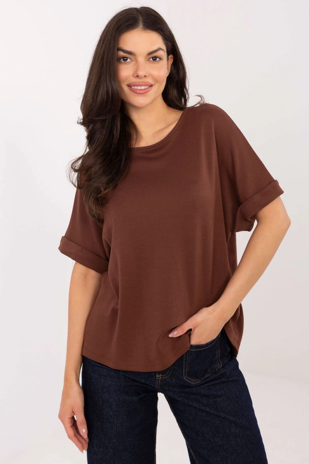 Dámský každodenní top vyrobený z měkkého materiálu typu viskóza je nabídkou spojující pohodlí a decentní eleganci. Materiál, který kombinuje bavlnu a modal, je jemný, mimořádně příjemný na dotek a poskytuje pohodlí po celý den. Model s standardní délkou, s krátkými rukávy a klasickým kulatým výstřihem, se obléká přes hlavu, což podtrhuje jeho volný, ležérní charakter. Hladký vzor činí top univerzálním a snadno kombinovatelným s různými kousky oblečení, od džínů po sukně nebo šortky.