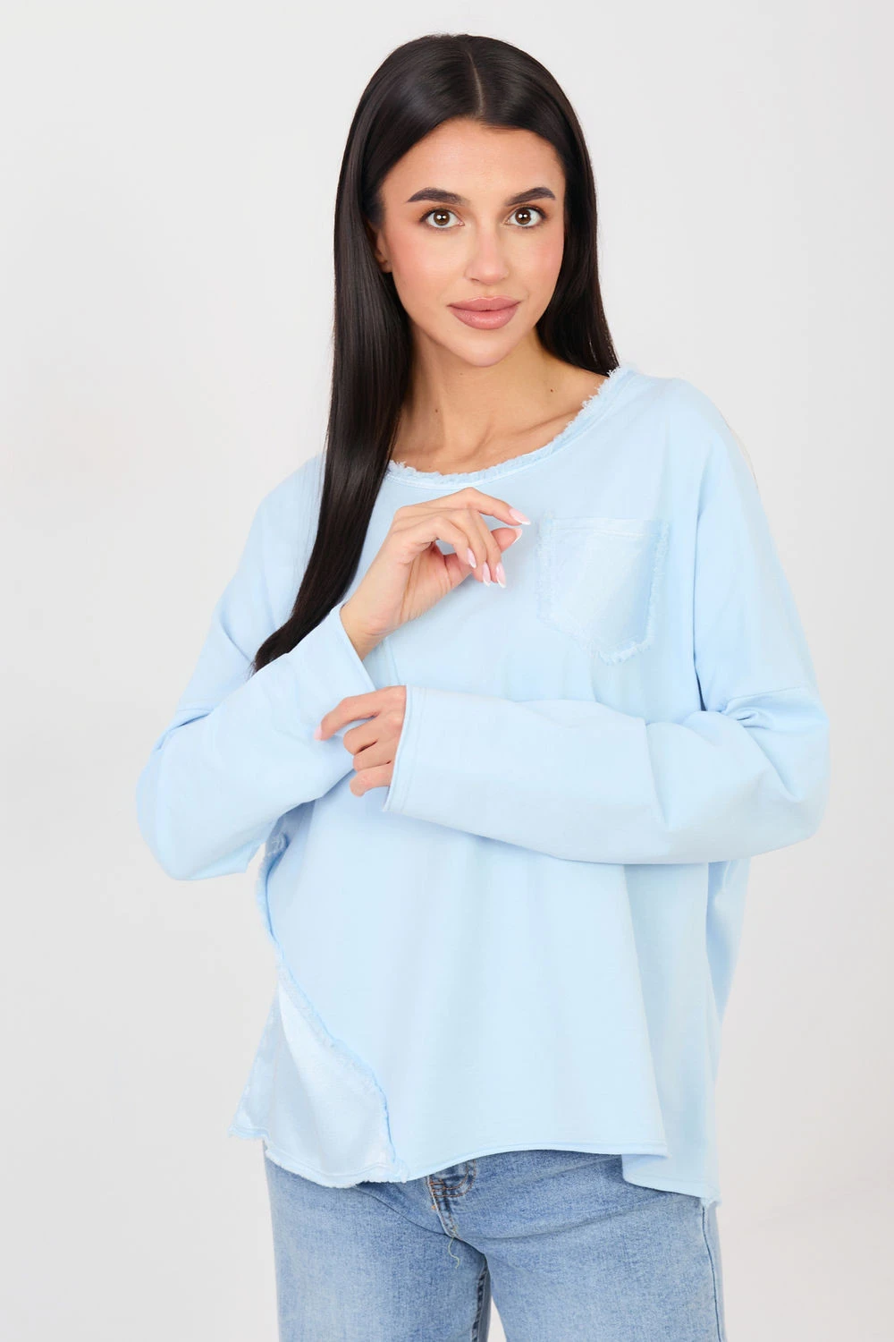 Každodenní blůzka s casual charakterem spojující pohodlí s decentními ozdobnými detaily. Vyrobená z měkké bavlny s přídavkem elastanu, poskytuje pohodlné nošení a lehké přizpůsobení se postavě. Model s hladkým vzorem má klasický kulatý výstřih a dlouhé rukávy, ideální na každodenní outfit. Ozdobný, neroztrhaný materiál kolem výstřihu, na kapse a po pravé straně dodává blůze charakter a originalitu. Standardní délka umožňuje dobře kombinovat blůzku jak s džínami, tak s sukni. Navíc praktická kapsa na hrudi zdůrazňuje casual styl a funkčnost modelu.