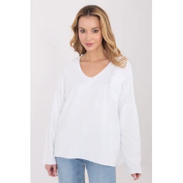 Každodenní volná blůzka, kombinující pohodlí s jemným ženským detailem. Vyrobená z měkké bavlny s přídavkem elastanu, zajistí pohodlí a lehce přizpůsobený střih. Standardní délka modelu má dlouhý rukáv a výstřih na lodičku, který jemně zdůrazňuje krk. Hlavním ozdobným prvkem je aplikace ve formě přišitého květínka, dodávající blůzce jemný, stylový akcent. Ideální volba pro každodenní, volné styly, které kombinují pohodlí s ženskou elegancí.
