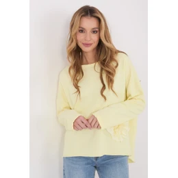 Klasický každodenní top s casual charakterem, spojující pohodlí s jemným ženským akcentem. Vyrobena z měkké směsi bavlny a polyesteru, poskytuje pohodlí nošení a odolnost materiálu. Model s hladkým pozadím má klasický kulatý výstřih a dlouhý rukáv, co ho činí univerzálním prvkem každodenního šatníku. Jemnou ozdobou je aplikace ve formě přišitého květínka na levé straně dole, dodávající topu jemný šarm a charakter. Chybějící zapínání zdůrazňuje jednoduchost a volný styl tohoto modelu.