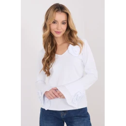 Elegantní blůza typu longsleeve s přiléhavým střihem, která efektně zdůrazňuje postavu a kombinuje klasiku s ozdobnými detaily. Vyrobená z vysoce kvalitní bavlny, zaručuje pohodlí nošení a příjemné přizpůsobení po celý den. Model s hladkým vzorem má výstřih do šířky, který jemně zdůrazňuje krk a dodává ženský charakter. Dlouhé zvonové rukávy dodávají celku lehkost a eleganci, zatímco ozdobné látkové květy umístěné na rukávech a u výstřihu představují výjimečný dekorační prvek. Standardní délka zaručuje, že se blůza skvěle hodí jak do každodenních outfitů, do práce, na schůzky nebo na elegantní výstupy a akce.