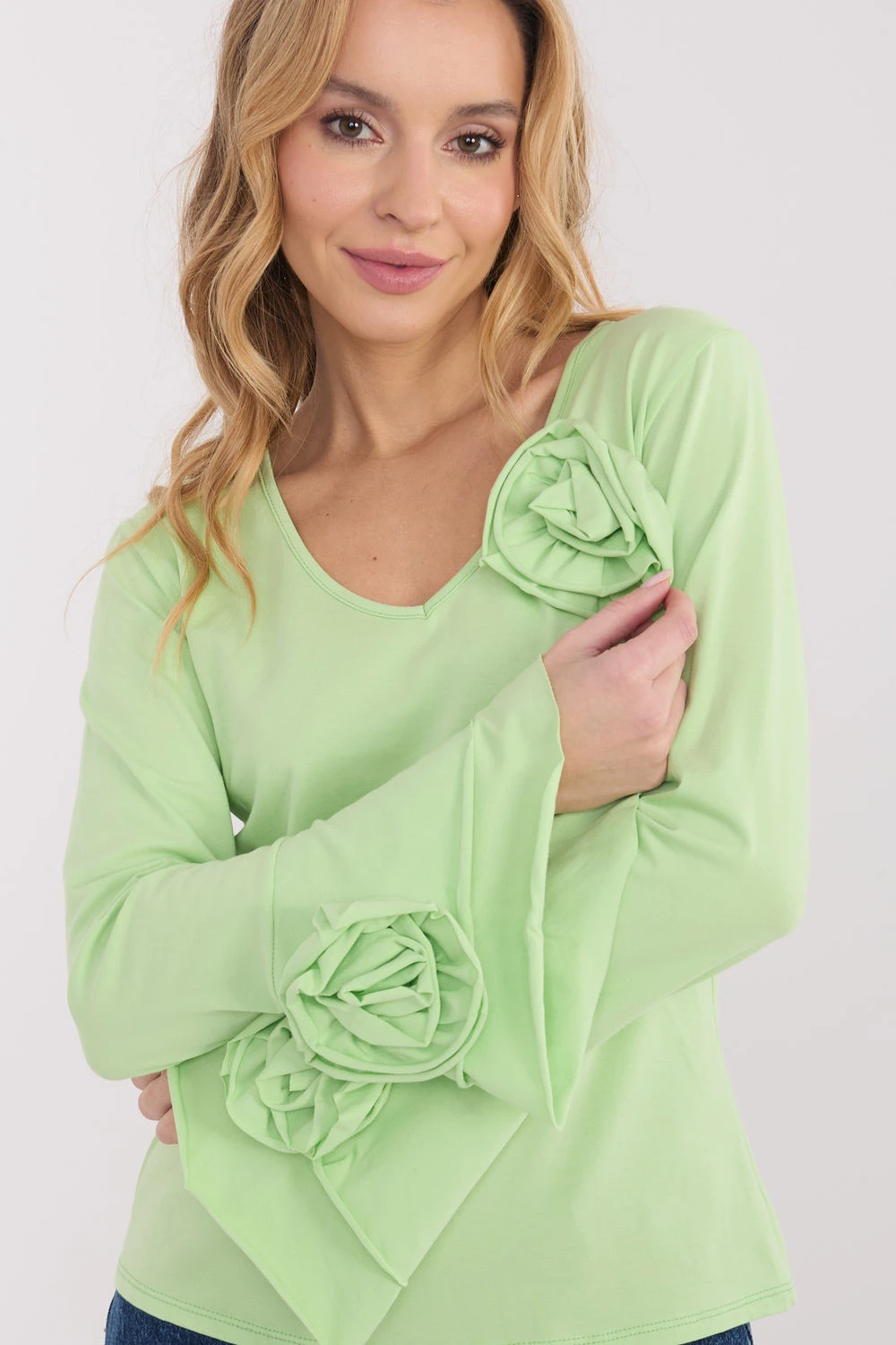Elegantní blůza typu longsleeve s přiléhavým střihem, která efektně zdůrazňuje siluetu a kombinuje klasiku s ozdobnými detaily. Vyrobena z vysoce kvalitní bavlny, poskytuje pohodlí a příjemné nošení po celý den. Model s hladkým vzorem má výstřih do V, který jemně zdůrazňuje krk a dodává ženský charakter. Dlouhé zvonové rukávy dodávají lehkost a eleganci, a ozdobné látkové květy umístěné na rukávech a kolem výstřihu představují výjimečný dekorační prvek. Standardní délka zaručuje, že se blůza skvěle hodí jak do každodenních stylizací, do práce, na oficiální schůzky, tak i na elegantní večírky nebo akce.