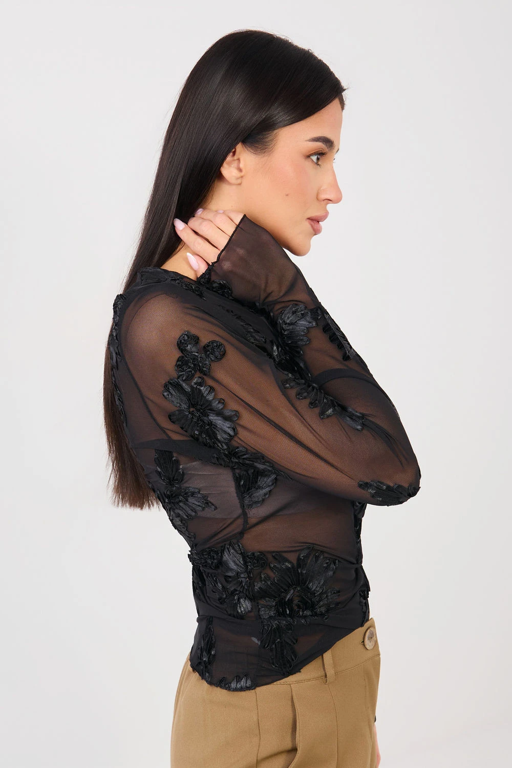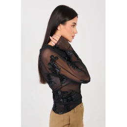 Elegantní, přiléhavá blůzka vyrobena z jemné síťoviny, která jemně zdůrazňuje postavu. Model se vyznačuje efektním vzorem vyšívaných květů, který dodává celku výjimečný a ženský charakter. Blůzka se skvěle hodí na slavnostní události a večírky, představující stylový prvek večerních outfitů. Dlouhý rukáv a klasický, kulatý výstřih jí dodávají eleganci a nadčasový vzhled. Vyrobena z polyesteru s přídavkem elastanu, zaručuje pohodlí nošení, pružnost a dobrou přiléhavost. Standardní délka z ní dělá skvělý doplněk jak k sukním, tak k elegantním kalhotám.