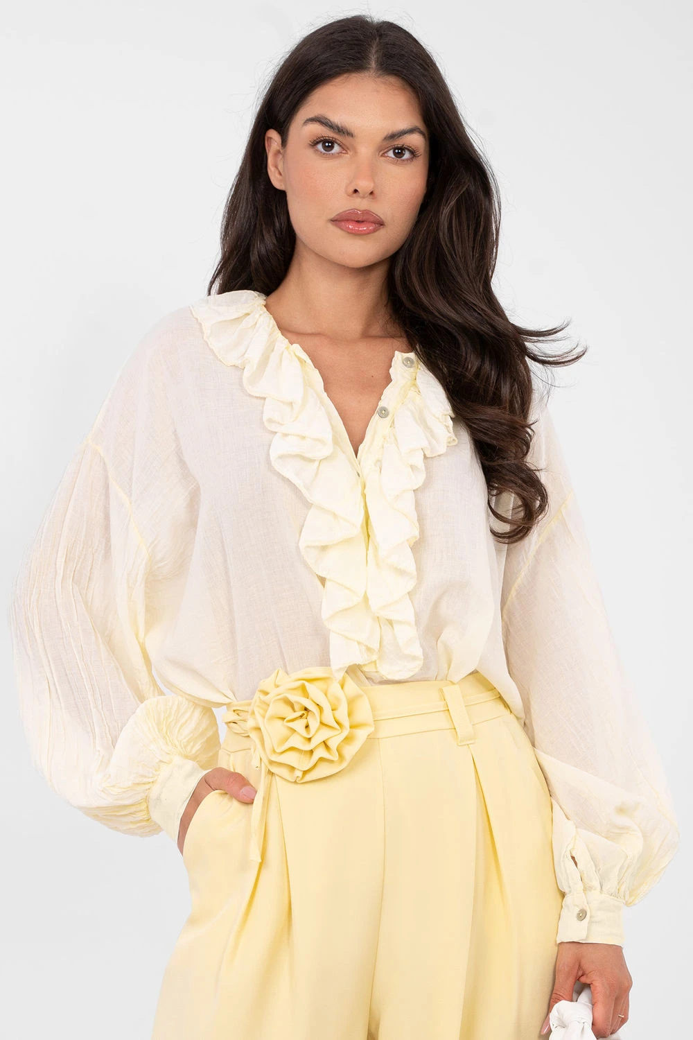Elegantní každodenní blůzka v boho stylu, kombinující pohodlí s ženským, lehce romantickým charakterem. Vyrobená z měkké bavlny, poskytuje pohodlí při nošení a volnost pohybu po celý den. Model s hladkým vzorem má klasický, kulatý výstřih s jemným žabotem, který dodává eleganci a jemný šarm. Vypasovaný, dlouhý rukáv zdůrazňuje ženský střih a dodává celkovému vzhledu moderního boho stylu. Zapínání na několik knoflíků vpředu usnadňuje oblékání a představuje jemný dekorativní detail. Standardní délka zaručuje, že blůzka se skvěle hodí jak do každodenních, tak do kancelářských stylizací, kombinujíc pohodlí s nadčasovým stylem.