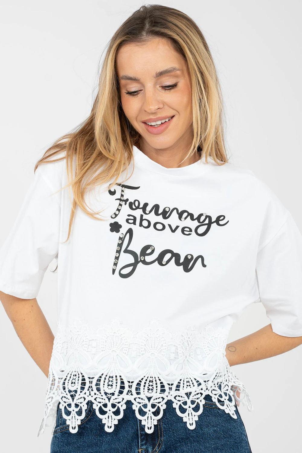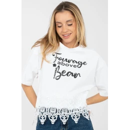 Každodenní dámský top s ženským a stylovým charakterem. Vyrobený z vysoké kvality bavlny s přídavkem elastanu, poskytuje pohodlí nošení, pružnost a dobře padne k postavě. Model s krátkou délkou a krátkým rukávem se skvěle hodí na teplejší dny. Kulatý výstřih zdůrazňuje klasický střih a dodává topu univerzální vzhled. Ozdobné nápisy na přední straně, doplněné cirkony, přitahují pozornost a dodávají celku módní nádech. Další výhodou je krajkový lem na spodní části topu a jemné cirkony, které mu dodávají ženský lesk. Ideální pro každodenní outfit s džíny, kraťasy nebo sukní.