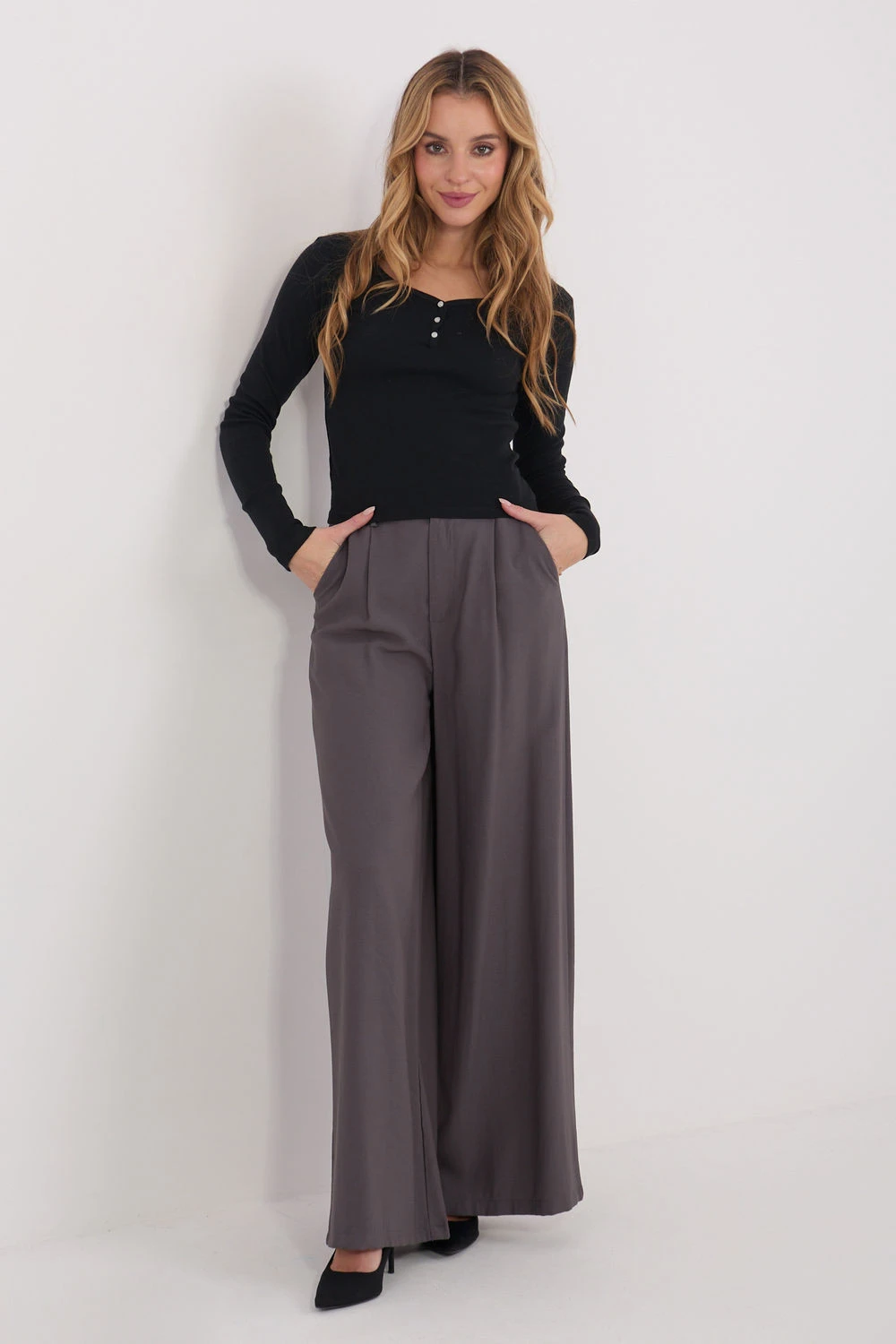 Přizpůsobený dlouhý rukáv je skvělou základnou pro každodenní outfit v casual stylu. Krátký střih jemně zdůrazňuje postavu a skvěle ladí s džíny, látkovými kalhotami nebo sukni s vysokým pasem. Model se hodí jak do každodenního života, tak do práce, kombinuje pohodlí s univerzálním designem. Blůzka je vyrobena z vysoce kvalitní bavlny, která zajišťuje pohodlí nošení, prodyšnost a jemnost na dotek. Hladký vzor jí dodává nadčasový charakter a usnadňuje vytváření různých outfitů. Model má dlouhé rukávy a klasický kulatý výstřih zapínací na tři knoflíky. Tento jemný detail přidává celkovému vzhledu ženské kouzlo a umožňuje jemné nastavení hloubky výstřihu. Je to praktická, stylová a všestranná volba do každého šatníku.