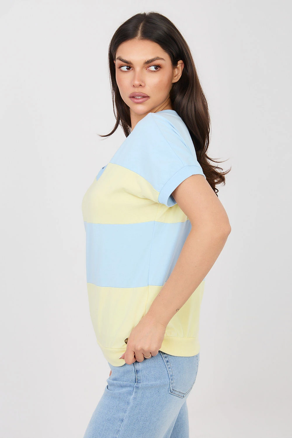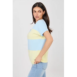 Elegantní dámský top v casual provedení, ideální na každý den. Model standardní délky má krátký rukáv a ženský výstřih do V, který jemně zdůrazňuje linii krku a dodává lehkost celému outfitu. Dominantním prvkem designu jsou široké pruhy, které dávají topu moderní a nadčasový charakter. Jednoduchý, pohodlný střih zajišťuje, že se model dobře přizpůsobí postavě a poskytuje volnost pohybu během každodenního nošení. Top je vyroben z vysoce kvalitní bavlny s přídavkem elastanu, díky čemuž je materiál měkký, příjemný k pokožce a lehce pružný. Model bez zapínání zdůrazňuje jeho pohodlný, každodenní charakter a skvěle se hodí do mnoha casual outfitů.