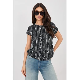 Stylová každodenní halenka je ideální volbou pro ženy, které oceňují pohodlí a módní vzhled ve svých každodenních outfitcích. Díky univerzálnímu střihu se skvěle hodí jak k džínům, kraťasům, tak i sukním. Model je vyroben z příjemné viskózy, která je lehká, prodyšná a pohodlná i v teplejších dnech. Halenka má kulatý výstřih a krátké rukávy, co jí dodává volný, ležérní charakter. Na materiálu je potisk, který je hlavním ozdobným prvkem a dodává celku módní vzhled. Halenka má standardní délku, díky čemuž se dobře přizpůsobí postavě a snadno ji lze sladit s různými kousky šatníku. Model se obléká přes hlavu bez zapínání, což zvyšuje pohodlí při nošení. Jedná se o praktický a stylový návrh na každý den, ideální pro mnoho každodenních outfitů.